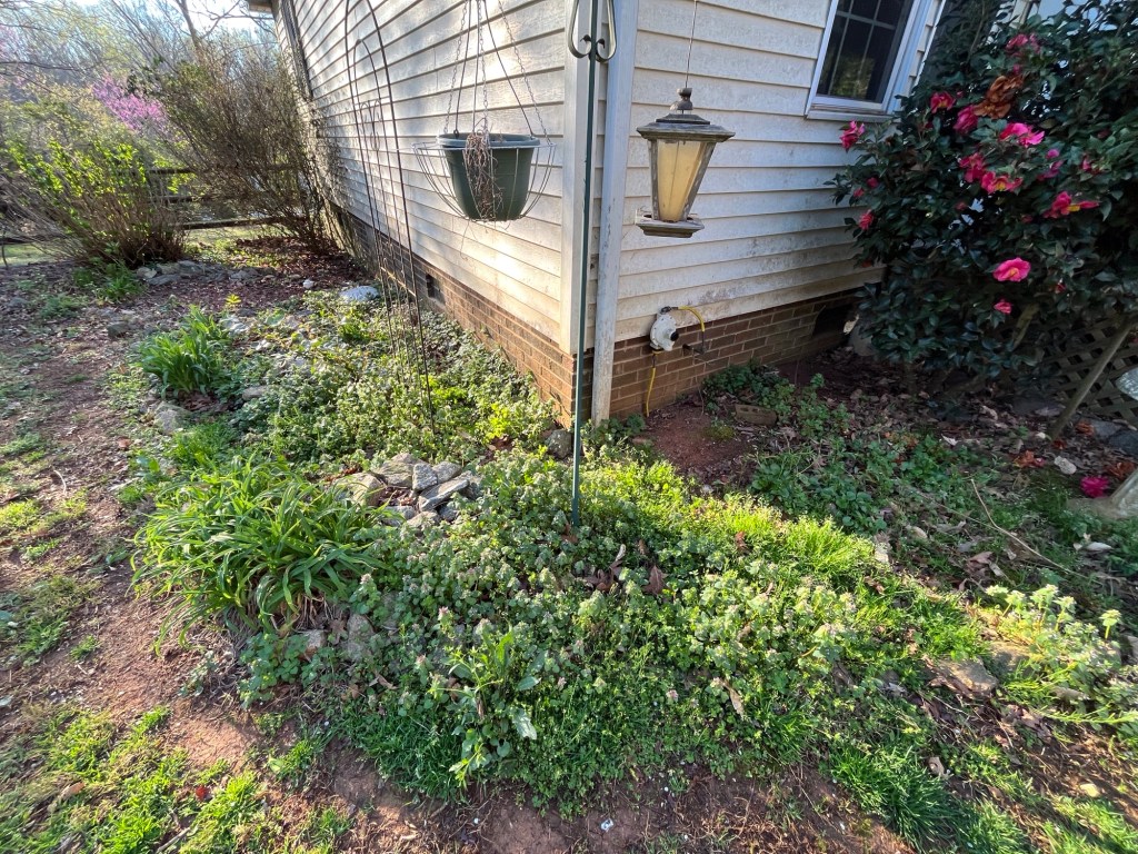 Spring has sprung with a weedy vengeance around here. The garden bed on the north side of the house is typical of how they all look (or looked) before yard work began.